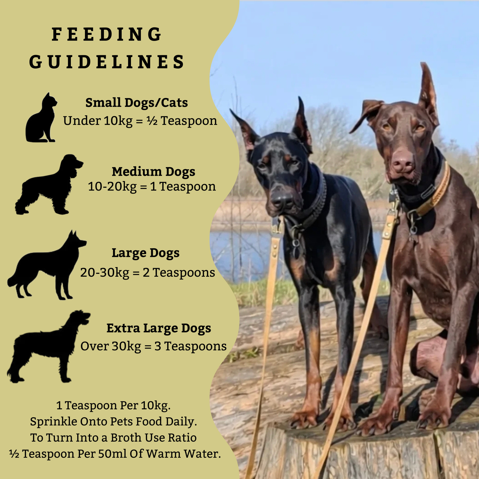 we recommend this product is sprinkled over your pets food daily or turned into a hydrating liquid using 1 teaspoons per 10kg or 1/2 Teaspoon per 50ml of warm water!