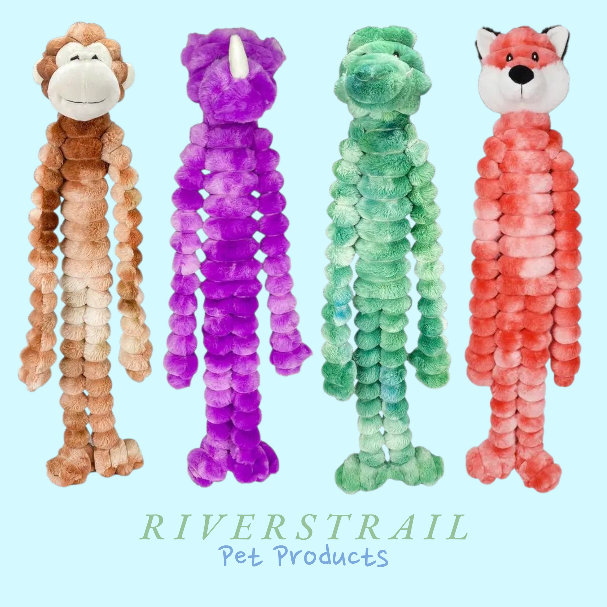 Our Crimply Cuddlerz come in four different animal shapes a very large toy each filled with extra squeakers and have a long cuddly body, a delightful addition to your pets toy box made with ethically sourced products promoting their entertainment and well being here are the characters;