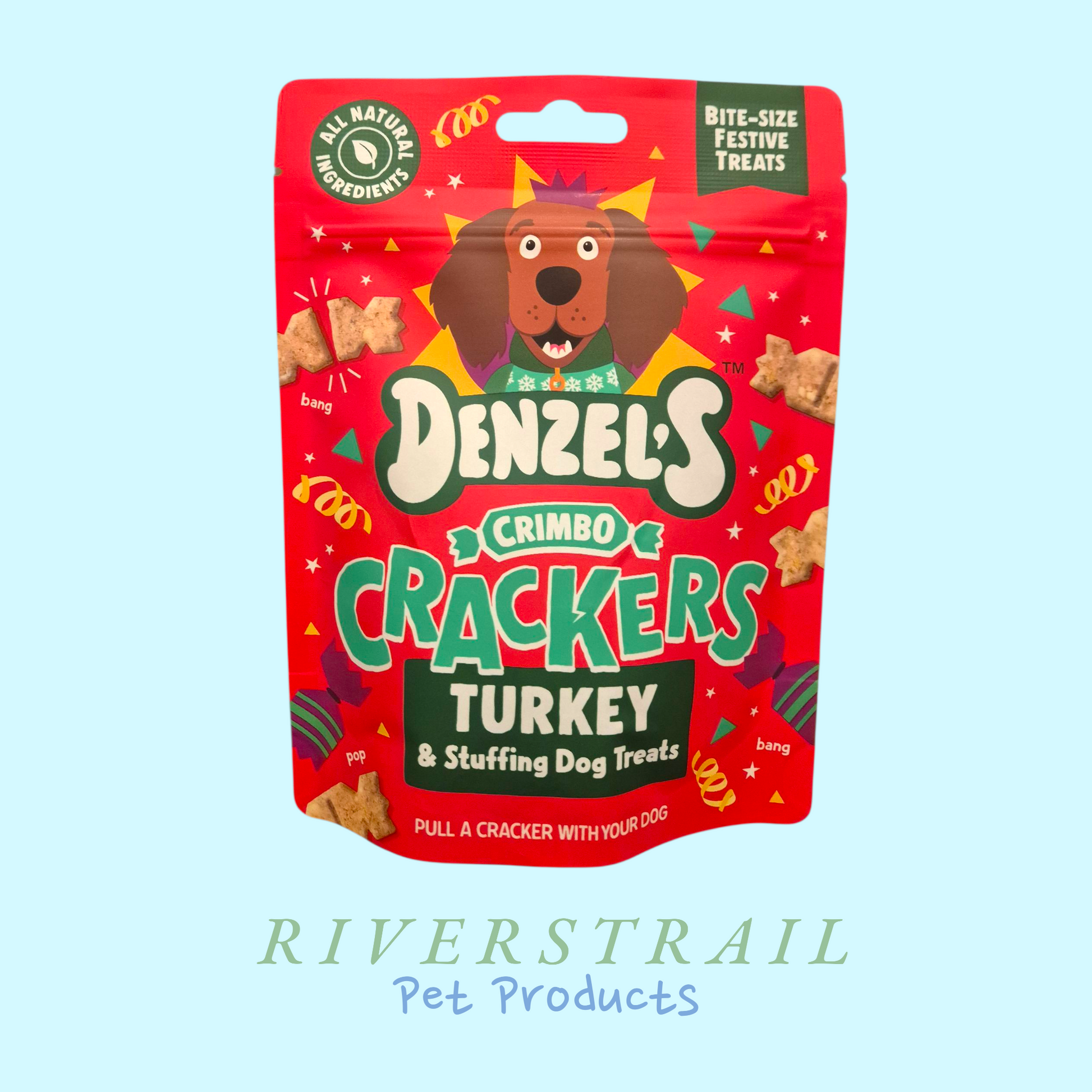 This product is from denzels a 90g bag of crimbo crackers a bite sized grain free treat made with natural ingredients composing of 18% dried turkey, pea flour, milled broad beans, vegetable glycerine, chickpea flour, dried sweet potato, rapeseed oil, dried cranberries and mixed herbs.