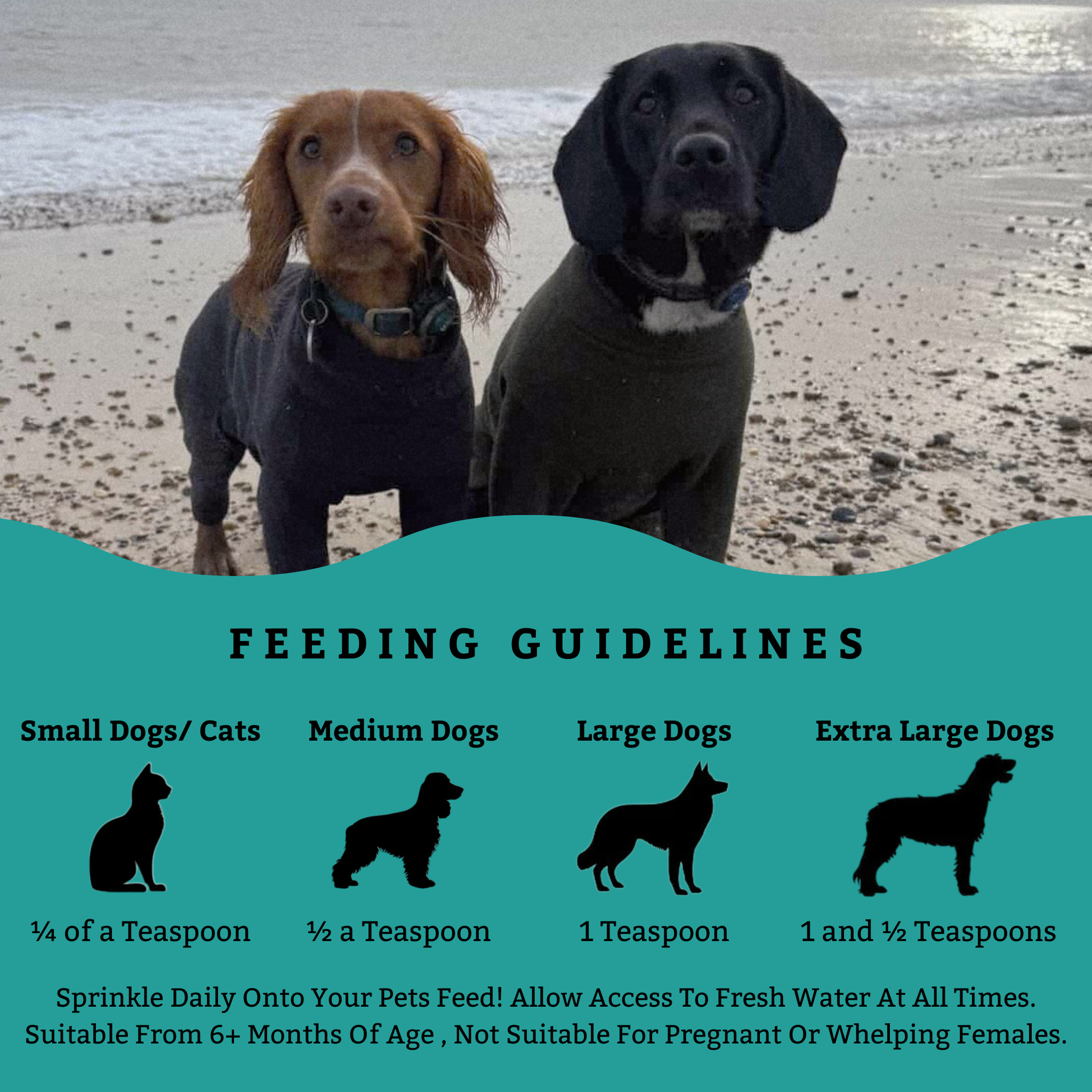 Feeding Guidelines - Small Dogs/Cats - 1/4 a teaspoon, Medium Dogs - 1/2 teaspoon, Large Dogs - 1 teaspoon and Extra Large Dogs - 1 and 1/2 teaspoons sprinkled onto your dogs food daily. generally recommended on dogs 6 months+ and not to be fed to pregnant or whelping females.