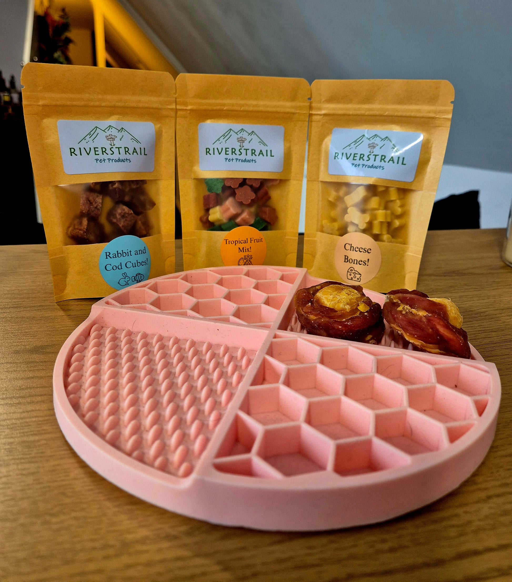- slow feeder lick mat ... 50g of cheese bones ... 50g of tropical fruit mix ... 50g of rabbits and cod cubes ... 2 egg yolks wrapped in duck! And for the upgraded version a random Pate flavour!
