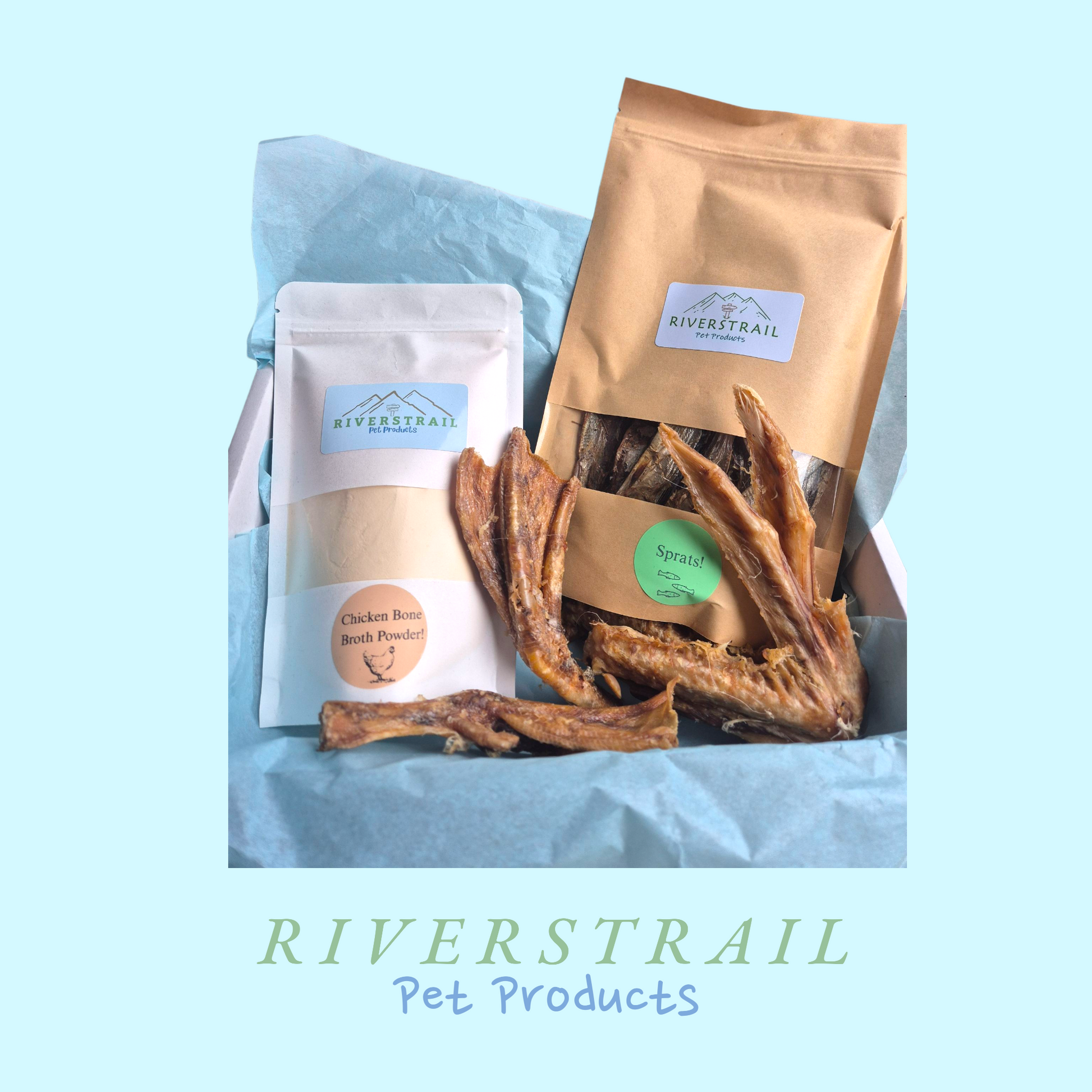 Including one 100g packet of chicken bone broth powder, 100g packet of sprats and 2 duck wings and 2 duck feet packed with glucosamine and chondrotin!