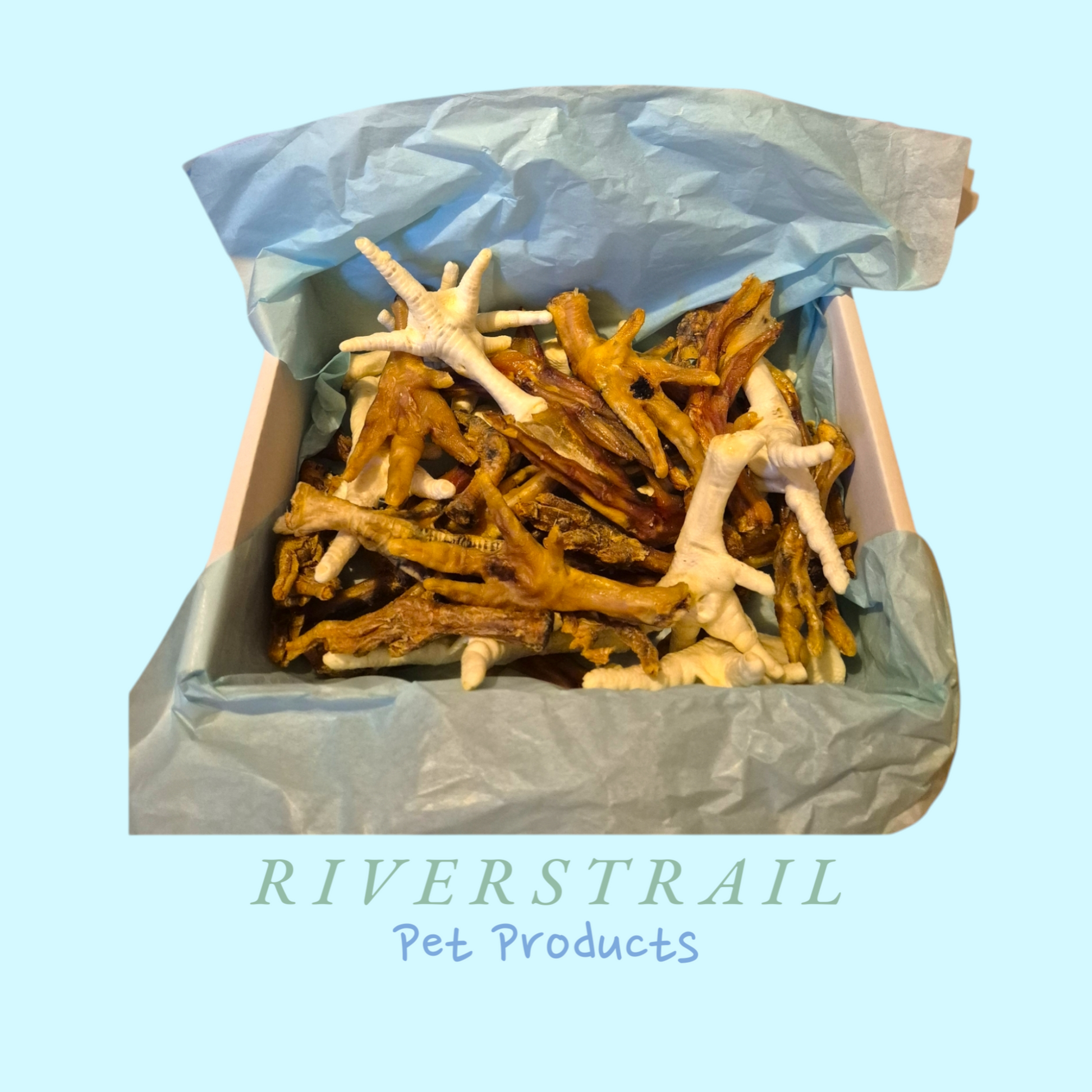 A Bundle Box filled to the brim with 40 Stinky feet , All Natural chicken and Duck Feet for your dogs to indulge in. The perfect box to bulk buy your dogs favorite Snacks in, chichen and duck feet are Packed full o glucosamine and condrotin Boosting your dogs Joint Support and they are also great at aiding in dental hygiene !